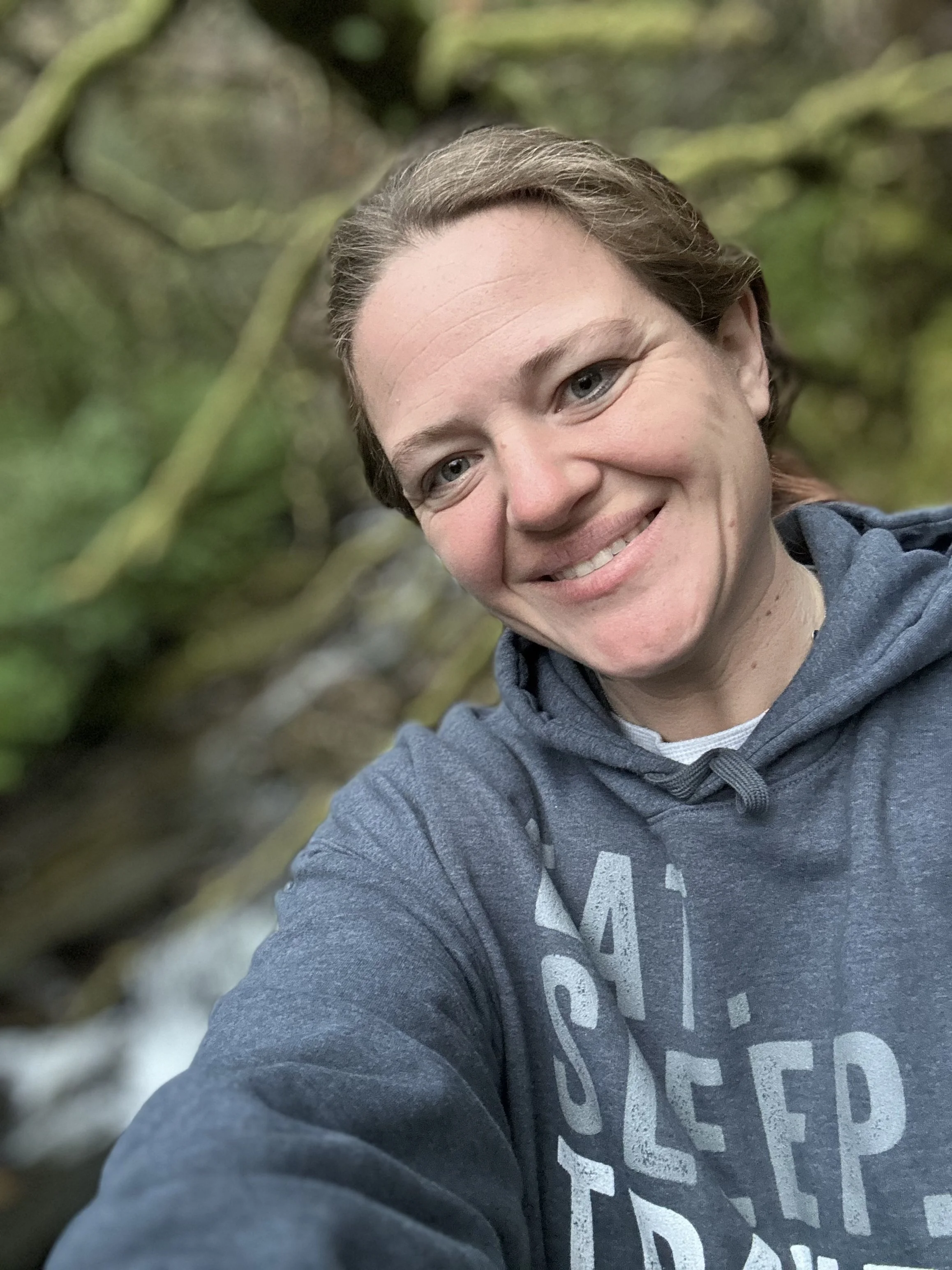 A smiling woman taking a selfie outdoors in front of a moss-covered tree and a small waterfall.