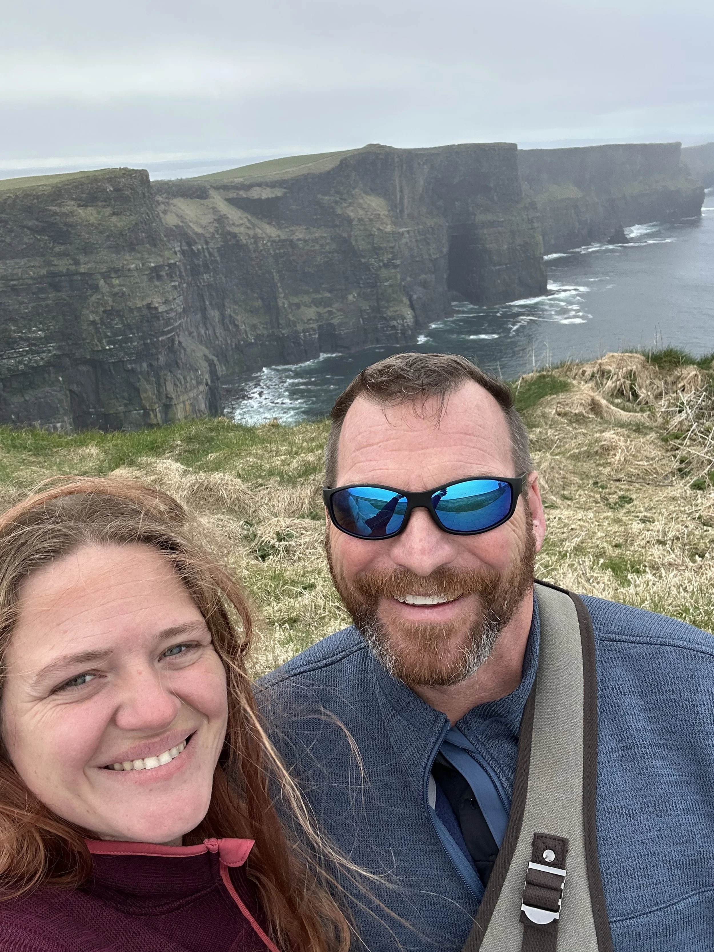 A smiling woman and man taking a selfie at the Cliffs of Moher in Ireland, with the rugged cliffs and ocean in the background.